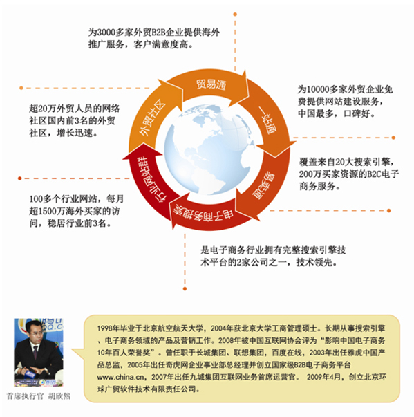 北京环球广贸软件技术有限责任公司成立于2009年7月,是一家专注于为中国中小企业提供外贸电子商务服务的高科技公司,拥有业界领先的电子商务搜索核心技术及全球搜索引擎营销技术,致力于帮助中国外贸企业实现独立的电子商务、获得国际竞争优势。目前“环球广贸”已经帮助超过10000家外贸企业实施了外贸独立电子商务,有超过20万企业会员通过“环球广贸”获得大量外贸机会。